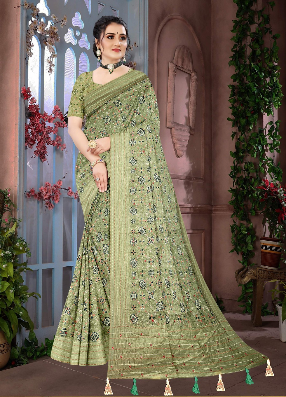 Parevdi Light Mehandi Stylish Flowery Print on Dola Silk With Katha Work